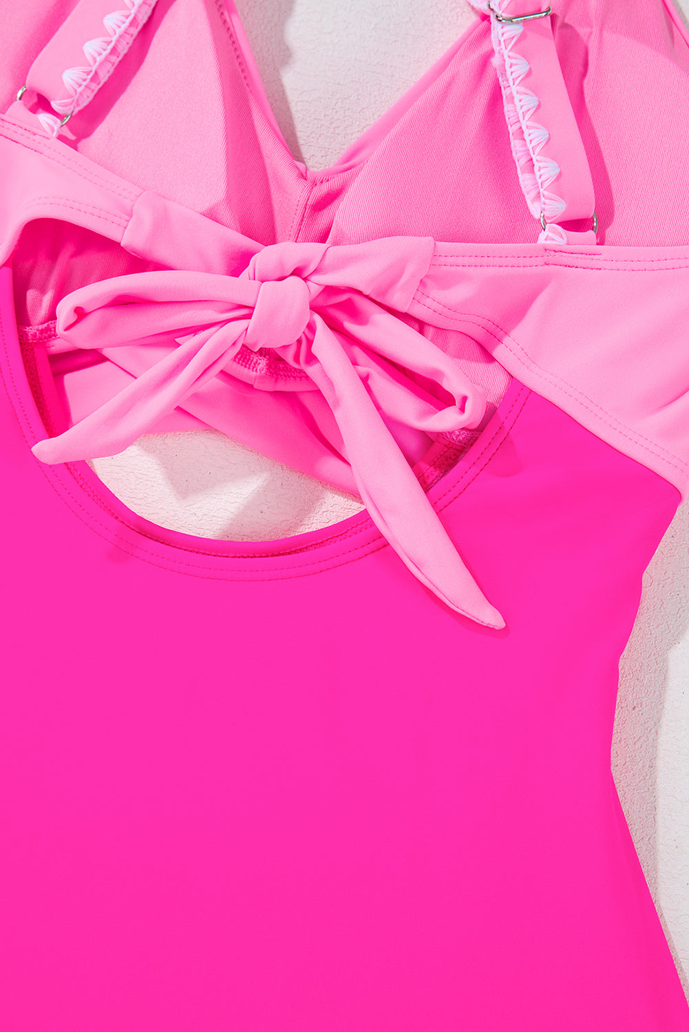 Rose Red Ric Rac Trim Contrasted Patchwork Cutout One Piece Swimsuit
