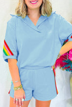 Sky Blue Rainbow Colorblock Collared Short Sleeve Top 2 Piece Shorts Set
