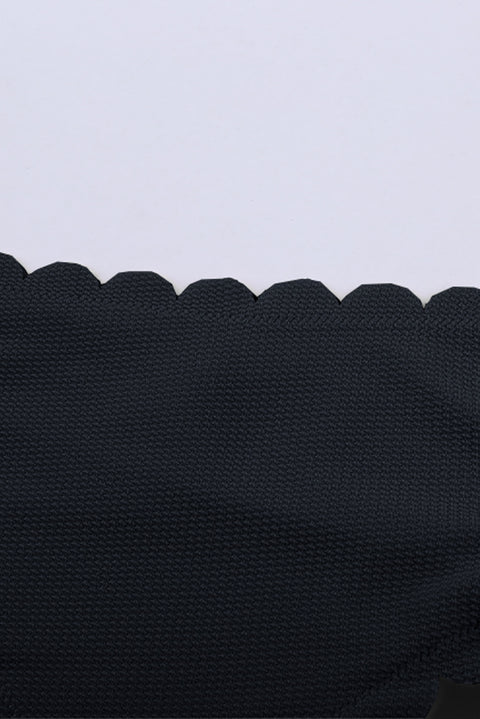 - The one-shoulder design with scalloped edges adds a trendy touch to this classic bikini style