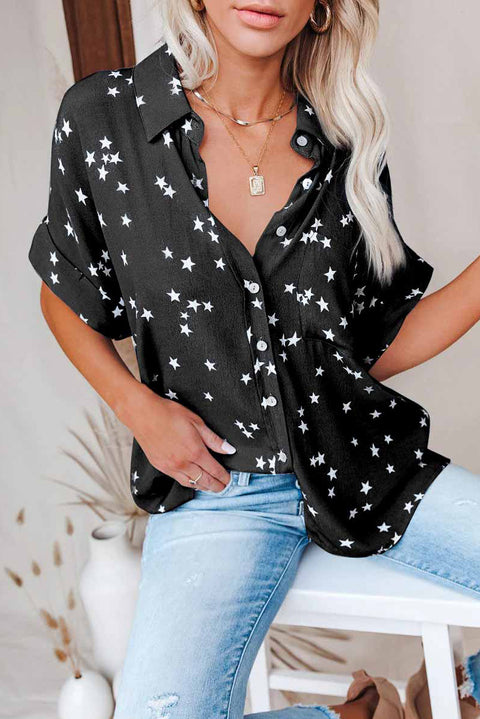 •It features chic star print all over and a collar with sewn cuffed sleeves. Finished with front button closures and a bust pocket