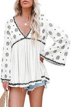 V Neck Embroidered Flare Sleeve Pleated Hem Top