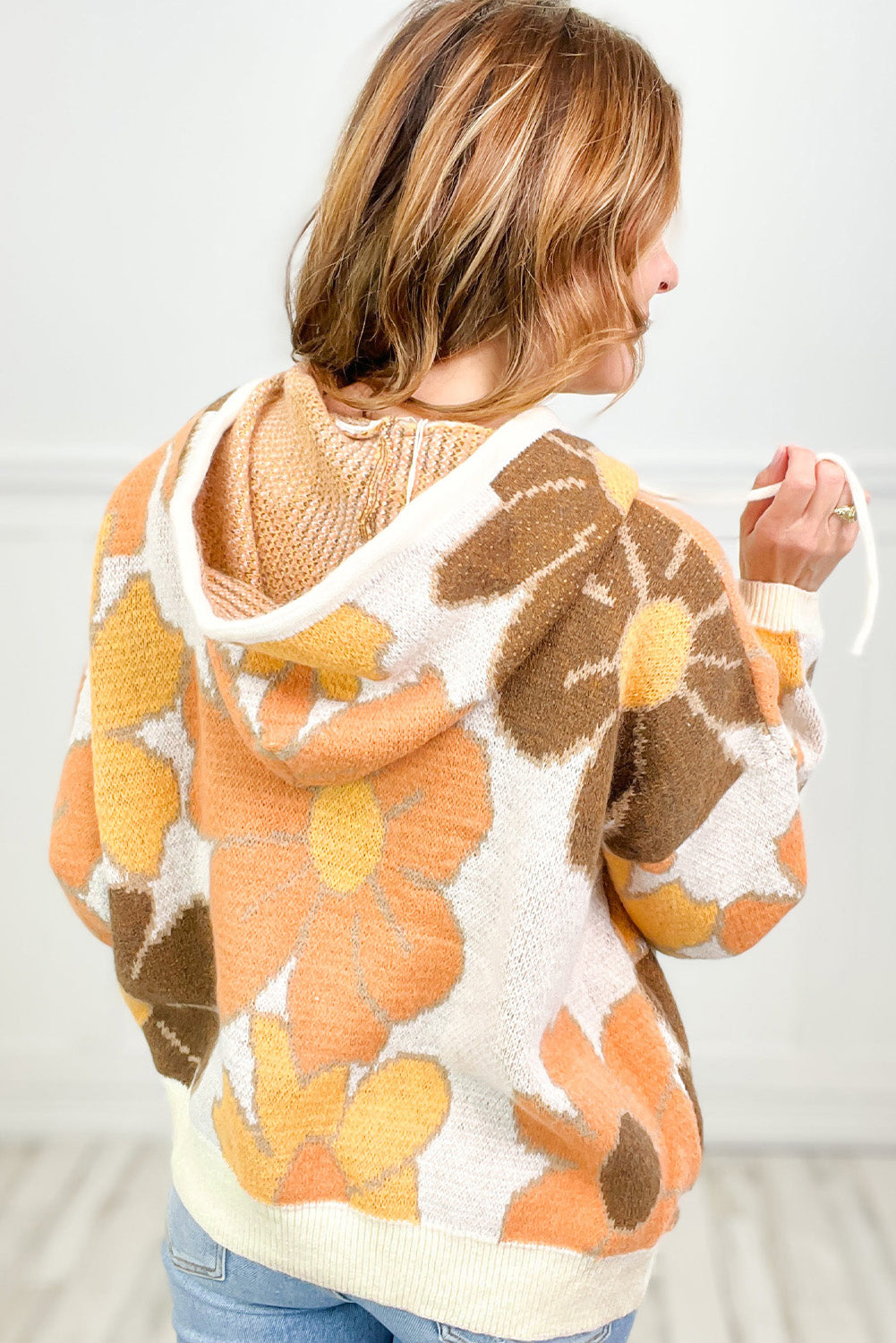 White Large Flower Knitted Drawstring Hooded Plus Size Sweater