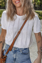 White Pointelle Knit Short Puff Sleeve Crewneck Sweater