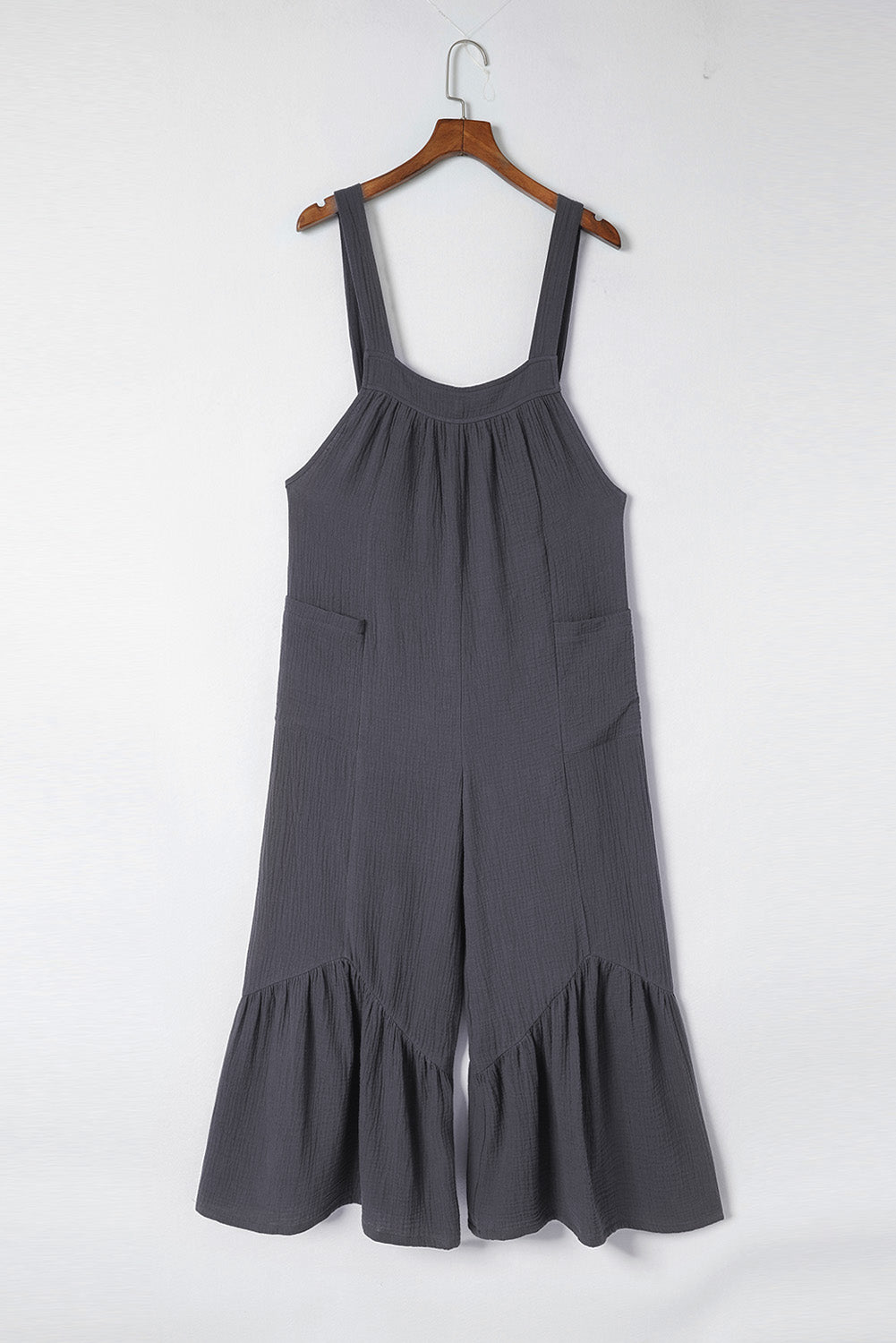 - This jumpsuit is chic and stylish with ruffled detailing on the wide leg