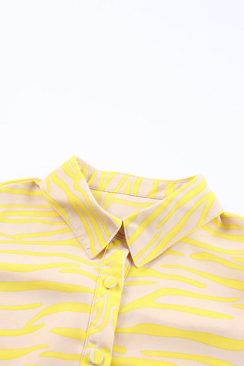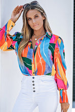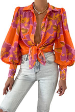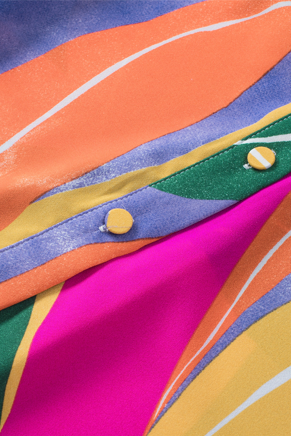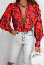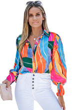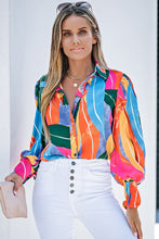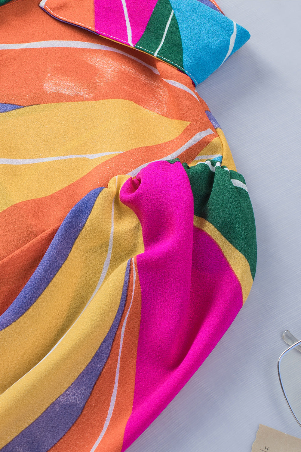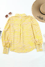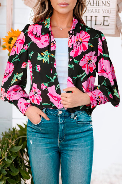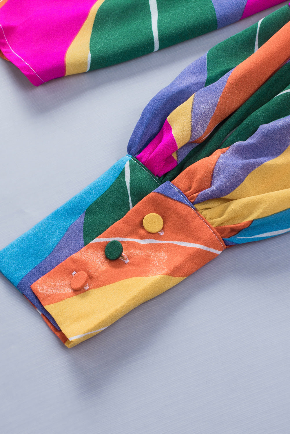 - Modest collar, center-front button opening, long puff sleeves with button cuffs